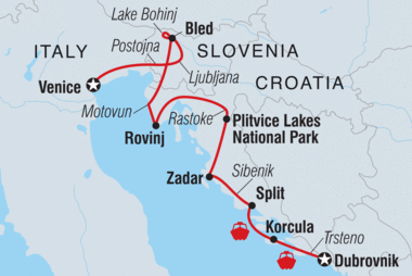 Discover a piece of paradise as you dive into the best of Slovenia and Croatia on a 16-day Premium adventure. Explore the glittering canals of Venice, the still waters of Lake Bled, the underground world of the Postojna Caves and the caves and waterfalls of Plitvice Lakes National Park. Go beneath the surface of Split and Dubrovnik, get away from the modern world and in with the locals and soak up ancient riches on the historic island of Korcula. From sun-soaked beaches to fantastic local wine, you’re never far from a good time on the Adriatic coast.