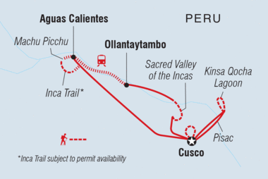 Journey through Peru on a seven-day Premium hiking adventure through ancient Inca sites and mountain trails, with an experienced and knowledgeable local leader by your side. Hike the ‘best part’ of the legendary Inca Trail in a single day – once used by Inca messengers and travellers to reach Machu Picchu, the Lost City of the Incas – and visit the Poc Poc Waterfall. Pass through the Sacred Valley and visit the Kinsa Qocha Lagoon – a stunning and unexpected sight in the surrounding landscape of Peru. Take a stunningly scenic train along the Urubamba River and spend a night in your Feature Stay in Aguas Calientes. Explore Chachabamba and Winay Wayna – a sacred site with terraces, temples and water channels, discover Machu Picchu (one of the Seven Wonders of the World) on a guided tour of the archaeological site and learn about Peru’s ancient cities and ruins.