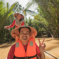 Today, you'll travel south to explore the Mekong Delta. When you arrive, board a boat and explore the intricate waterways. Often referred to as ‘the rice bowl’ of Vietnam, the fertile delta is where rice, tropical fruit and flowers are grown for the whole country. Disembark at Ben Tre and visit a local cottage industry to sample the candy that the region is famous for. You’ll have the opportunity to take a tuk-tuk around this remote village and stop to sample tropical fruit, see a honey farm and learn more about rural life. For lunch, go to a restaurant in the heart of the delta and try regional specialities such as the famous elephant-ear fish. After lunch, board sampans (small rowing boats) and paddle along the canals under the shade of lush water coconut trees. Stay overnight at a guesthouse on the river and swap stories with your hosts.