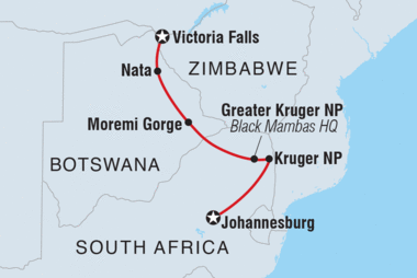 Encounter wildlife and salt pans on this eight-day overland adventure that visits two of Southern Africa’s most famous sites – Kruger National Park and Victoria Falls. Spot lions, leopards, zebras and giraffes on safari through landscapes blessed with breathtaking natural beauty, then fall asleep to the sounds of the African night in your comfortable camp. Keep your eyes peeled for the Big Five in South Africa’s Kruger National Park, enjoy a bushwalk accompanied by members of the world's first all-female anti-poaching unit, The Black Mambas, and end an epic journey with Zimbabwe’s mighty Victoria Falls.