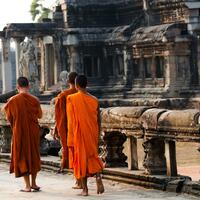 Spend a full day visiting the amazing temples of Angkor today – this UNESCO World Heritage site is one of the most important historic complexes in all South East Asia and is an absolute must-do experience in Cambodia! If you’re keen to see Angkor Wat at sunrise – the largest and most complete structure and the only temple with a west-facing entrance – your leader can organize an early visit for you before dawn (optional). Later in the morning, your group will tour the complex together. Of all the temples visited, Bayon is the centrepiece, with over 200 smiling carved faces and more than 50 gothic towers. You’ll also visit an ancient monastery, where you’ll meet a Buddhist monk to take part in a ritual that has survived for thousands of years. Sit on the floor as the monk chants and sprinkles holy water over you before tying a sacred thread around your wrist, ensuring protection and good luck for the rest of your journey. For lunch today, you'll visit the Spoons Restaurant and School where disadvantaged local youth learn skills that enable them to find gainful employment in the hospitality industry. After, head to Ta Prohm – a temple where nature has taken over, as large trees dominate the stone foundations. If you’re keen to see Angkor Wat in all its glory, you can also opt to end the day with a sunset view of the temples – just organize with your leader.