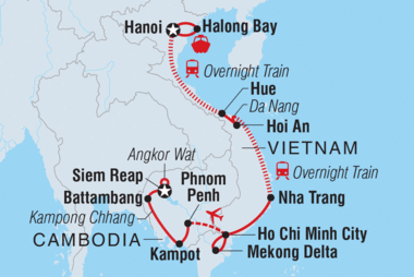 Chop, slice and chomp your way through the diverse flavours of South East Asia on this mouth-watering adventure into Vietnam and Cambodia. Vietnam’s prized cuisine is bursting with fresh, spicy and complex flavours, while across the border, Cambodia’s food is humble, often unexplored and no less delicious. Drink in cafes and beer halls that sprawl out over city streets, buy fruit from wicker baskets draped over a vendor’s shoulders and sit at market stalls as aromatic noodle soups are whipped up in front of you. From a sunset cruise on Ha Long Bay and a cycle past herb farms near Hoi An to discovering the French influence of Phnom Penh and meeting charming local communities at Preah Dak, these South East Asian powerhouses will fill you with great food and even more memorable experiences.