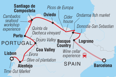 Welcome to the Iberian Peninsula, home to some of the world's freshest seafood, finest wines and most flavourful local produce. On this 17-day trip across Northern Spain and Portugal, tingle your tastebuds as you eat and drink your way through cities and towns made famous by their cuisine. Hop from taperias to wine bars, learn how to cook authentic and delicious local meals, explore ancient wine cellars and fresh food markets and wander the fields of a farm before sitting down to a home-cooked meal. From sweet Portuguese tarts to savoury Spanish jamon, delight all your senses on this food-forward adventure.